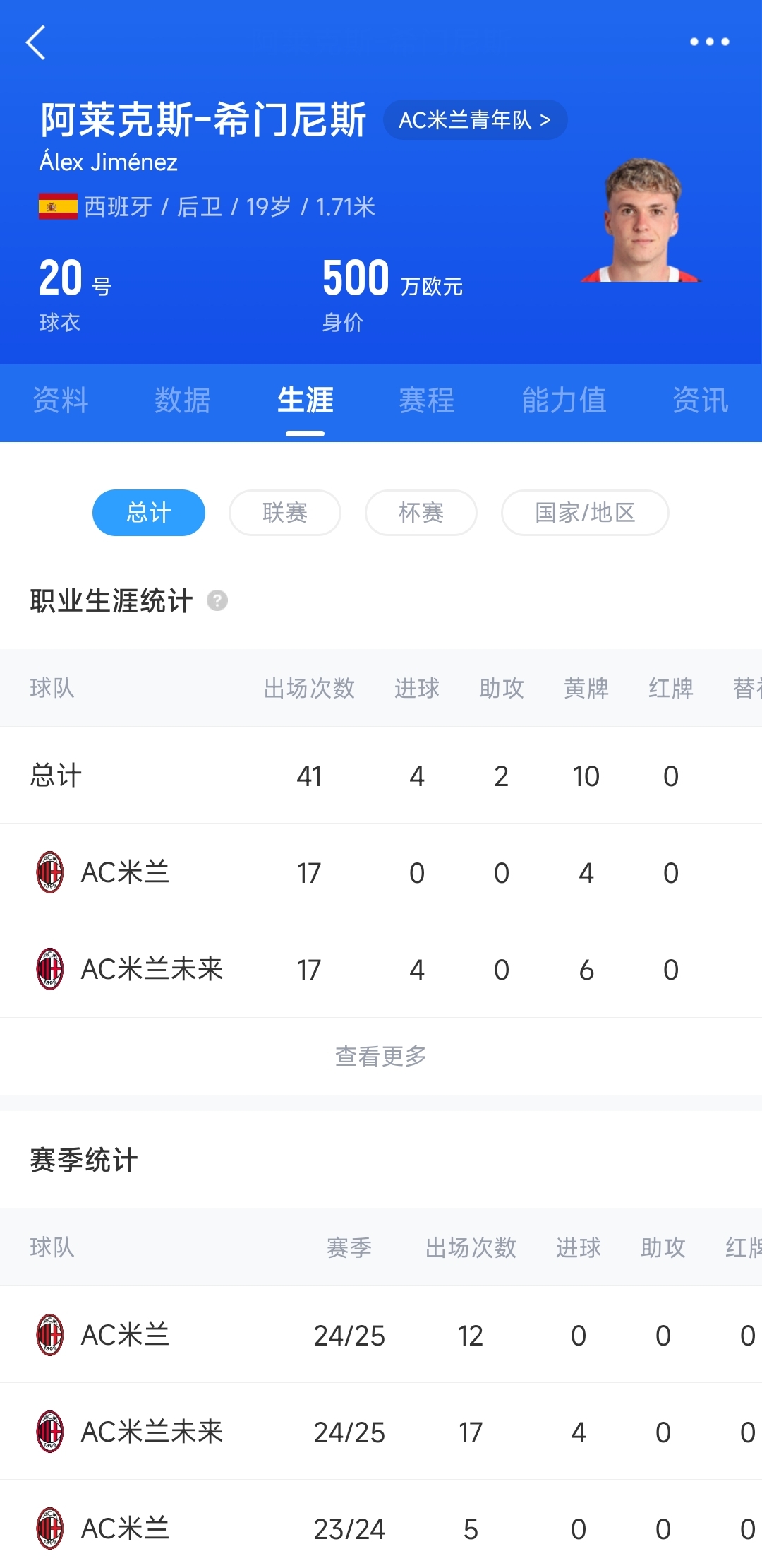 2024年夏窗,希門尼斯以500萬歐元的買斷費正式從皇馬加盟米蘭,簽約至2028年。本賽季希門尼斯已經(jīng)代表AC米蘭出戰(zhàn)12場比賽,出場時間2131分鐘。