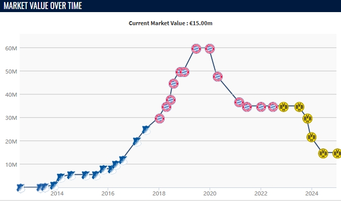 聚勒與多特的合同2026年到期,多特希望在今年夏天能甩掉這份大合同。聚勒目前的德轉身價為1500萬歐,在拜仁效力期間,他的巔峰身價曾達到6000萬歐。