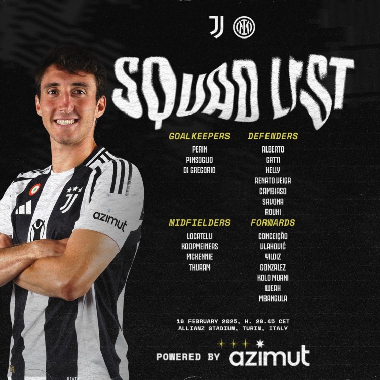 2月16日訊 北京時(shí)間明天凌晨3點(diǎn)45分,尤文將在意甲第25輪比賽中主場(chǎng)對(duì)陣國(guó)米。尤文公布了此役的球員名單,坎比亞索復(fù)出,道格拉斯-路易斯、卡巴爾、米利克、布雷默、卡盧盧缺席。