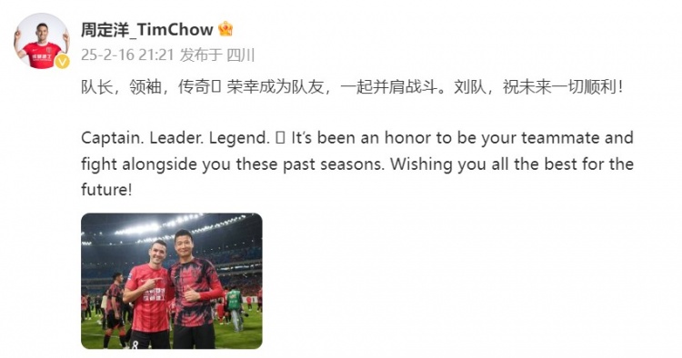 2月16日訊 成都蓉城俱樂部官方宣布,40歲老將劉濤離隊,隊友周定洋在個人微博中為劉濤送上祝福。