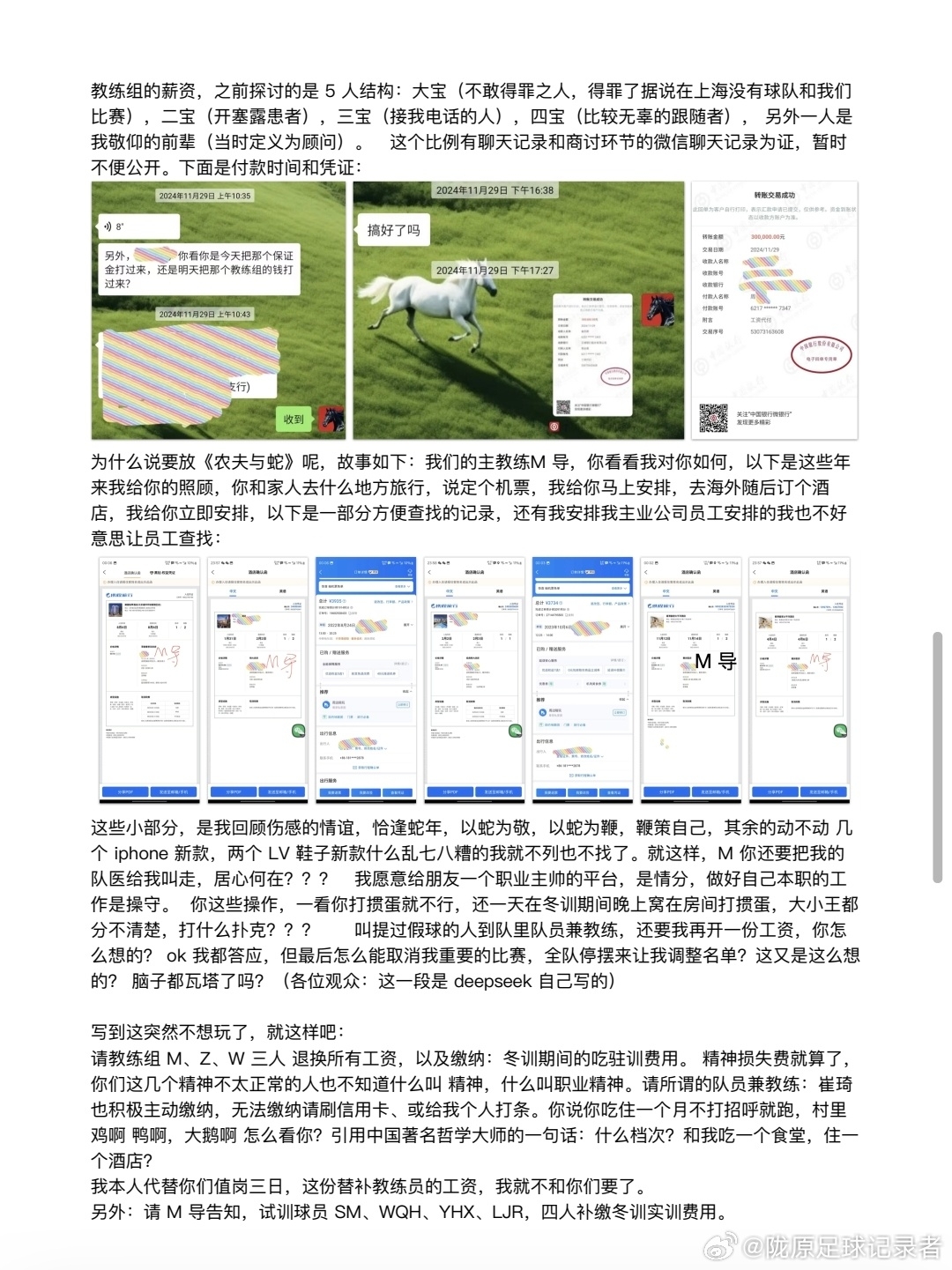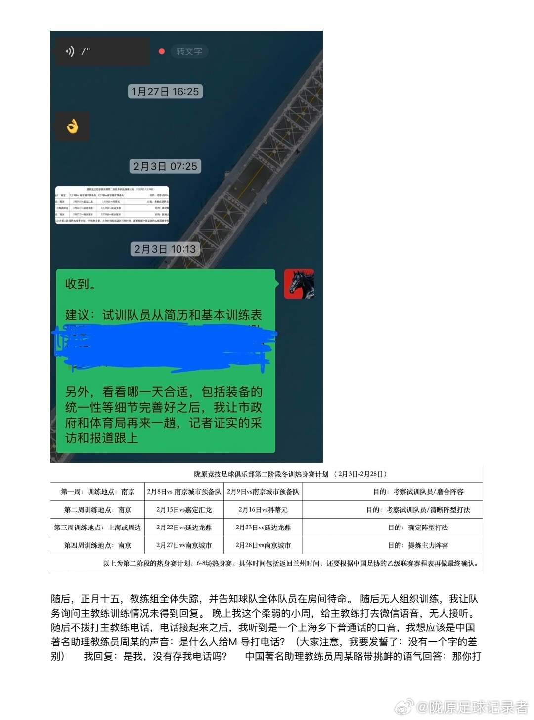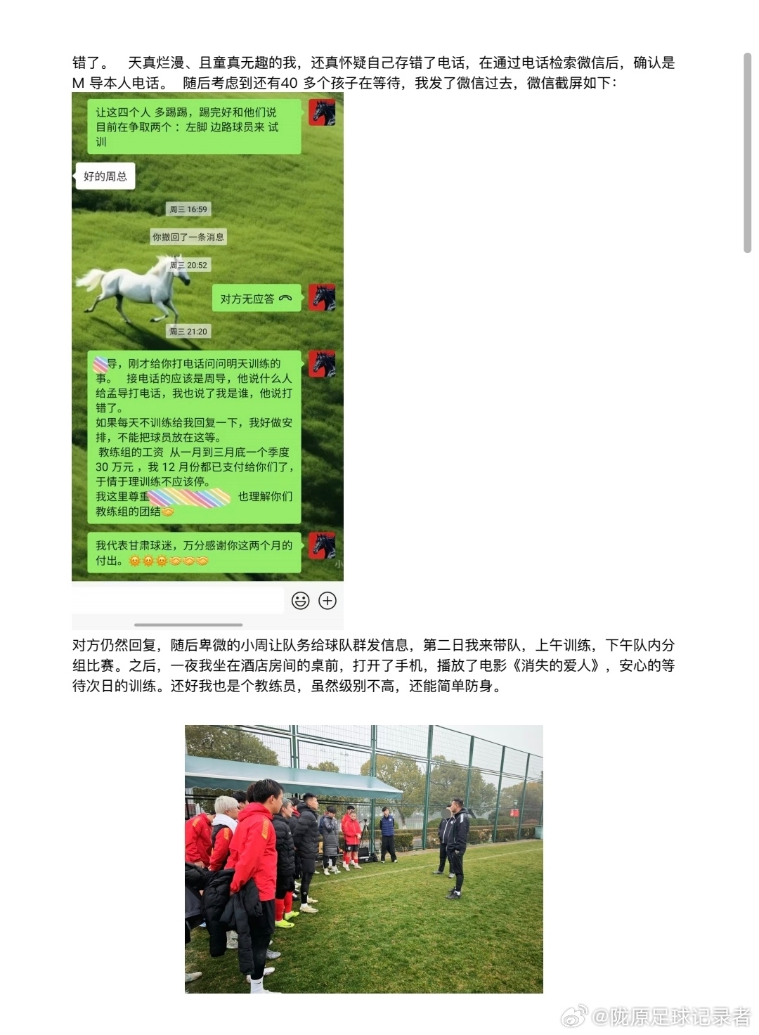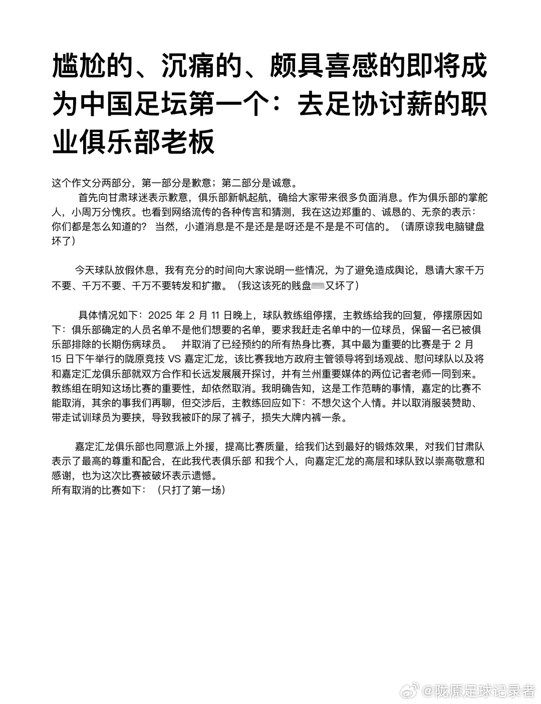 博主寫道:“蘭州隴原競技足球俱樂部遭遇內(nèi)部風波,教練組因投資人不同意引進一名長期處于傷病狀態(tài)的球員而集體停擺失聯(lián),熱身賽被取消,一季度預付的工資尚未退回?!边@種狗血的事情讓我們年輕的蘭州球隊遇到了,支持俱樂部周總維護自身和俱樂部的合法權(quán)益,抵制中國足球圈的糟爛人情世故亂象,呼吁那些不熱愛中國足球的沒有多少文化的酒蒙子,寄生蟲們滾出足球圈!