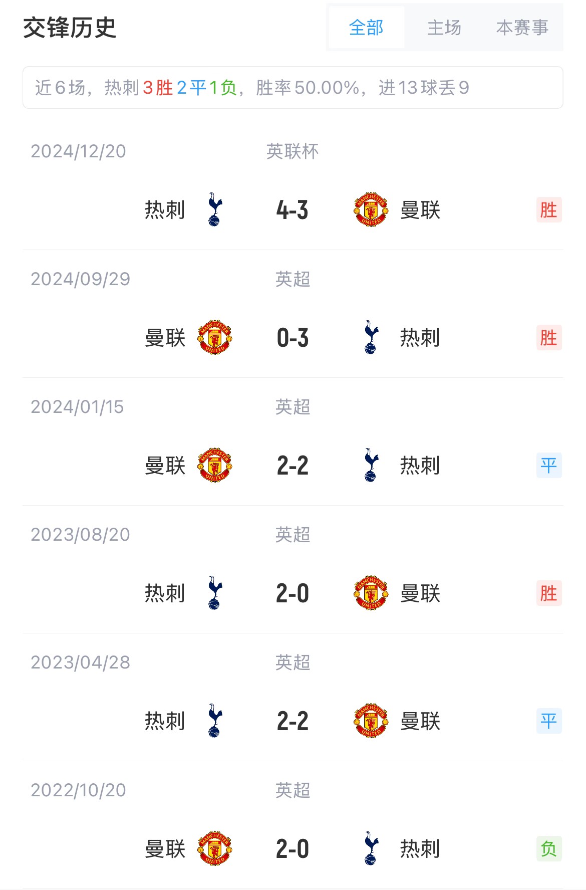 曼聯(lián)目前以29分排在第14名,熱刺27分排在第15。曼聯(lián)對熱刺已五場不勝,本賽季的兩次交手分別聯(lián)賽主場0-3慘敗、聯(lián)賽杯客場3-4不敵熱刺。