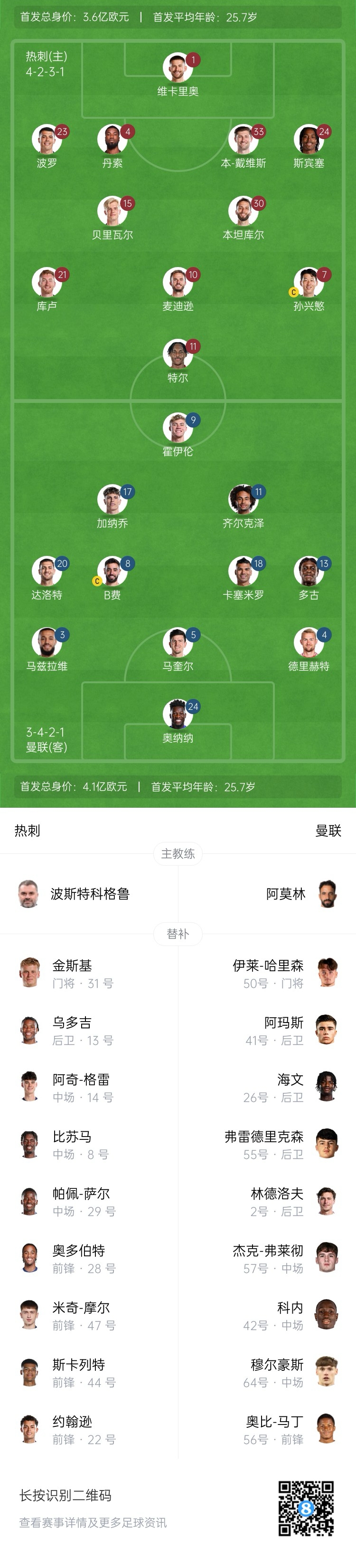 熱刺替補:31-金斯基、13-烏多吉、14-阿奇-格雷、8-比蘇馬、29-佩普-薩爾、47-摩爾、28-奧多伯特、22-布倫南-約翰遜、44-斯卡利特