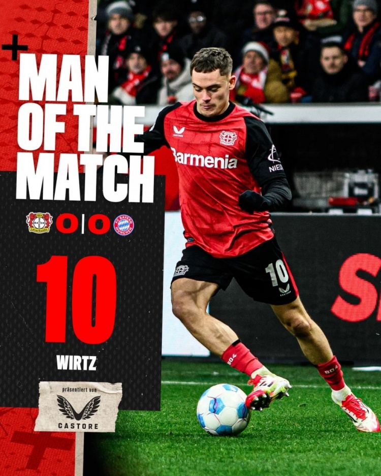 2月17日訊 德甲第22輪焦點戰(zhàn),勒沃庫森主場0-0和拜仁握手言和。賽后,勒沃庫森官方宣布,維爾茨當(dāng)選本場比賽的隊內(nèi)最佳球員。