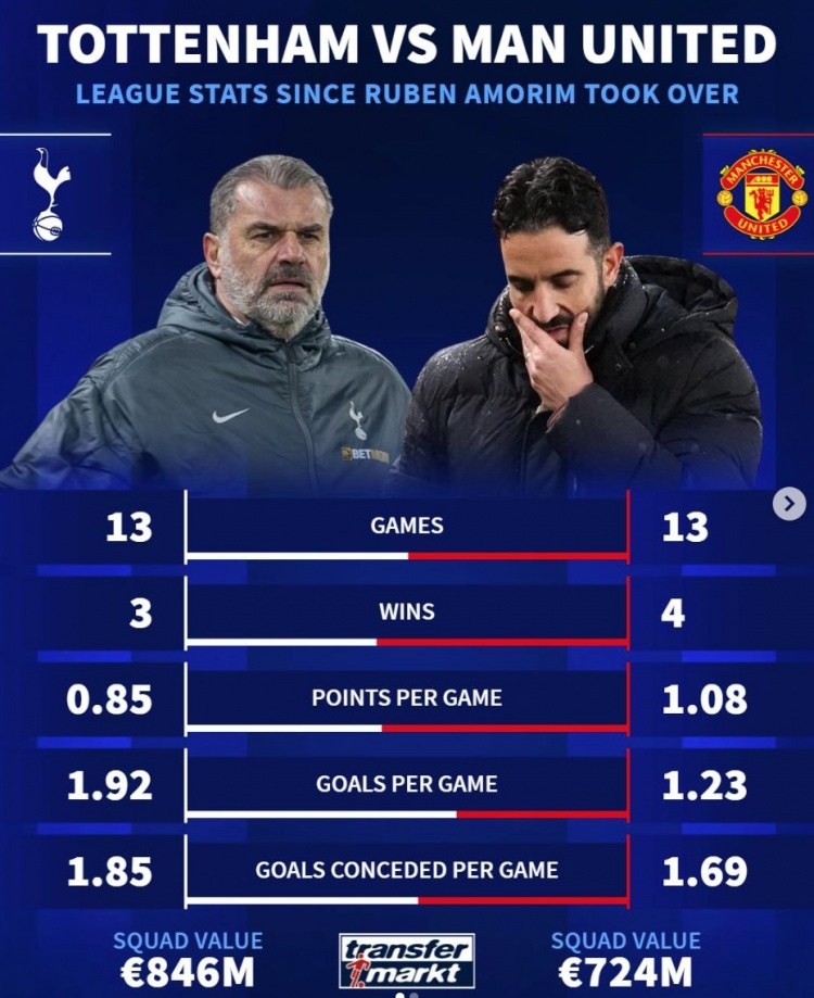 數(shù)據(jù)統(tǒng)計(jì)顯示,自阿莫林接手曼聯(lián)以來(lái),紅魔英超近13輪僅4勝,場(chǎng)均1.08分、打進(jìn)1.23球、丟1.69球;而澳波同期帶領(lǐng)熱刺13輪僅3勝,場(chǎng)均0.85分、打進(jìn)1.92球、丟1.85球。