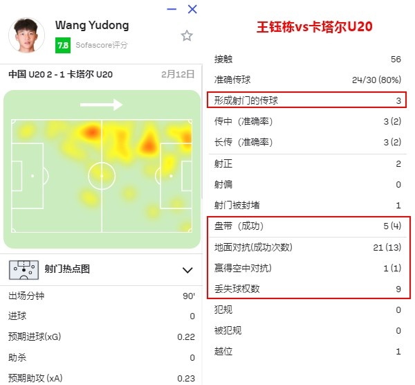 從對戰(zhàn)卡塔爾U20比賽中的數(shù)據(jù)可以看到,王鈺棟5次過人4次成功,22次一對一對抗贏下14次,送出3次帶來射門的關鍵傳球。