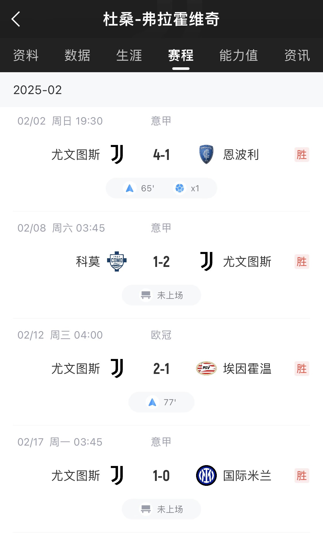 2月份至今尤文的4場比賽,弗拉霍維奇2場未登場,2場替補(bǔ),打入1球。