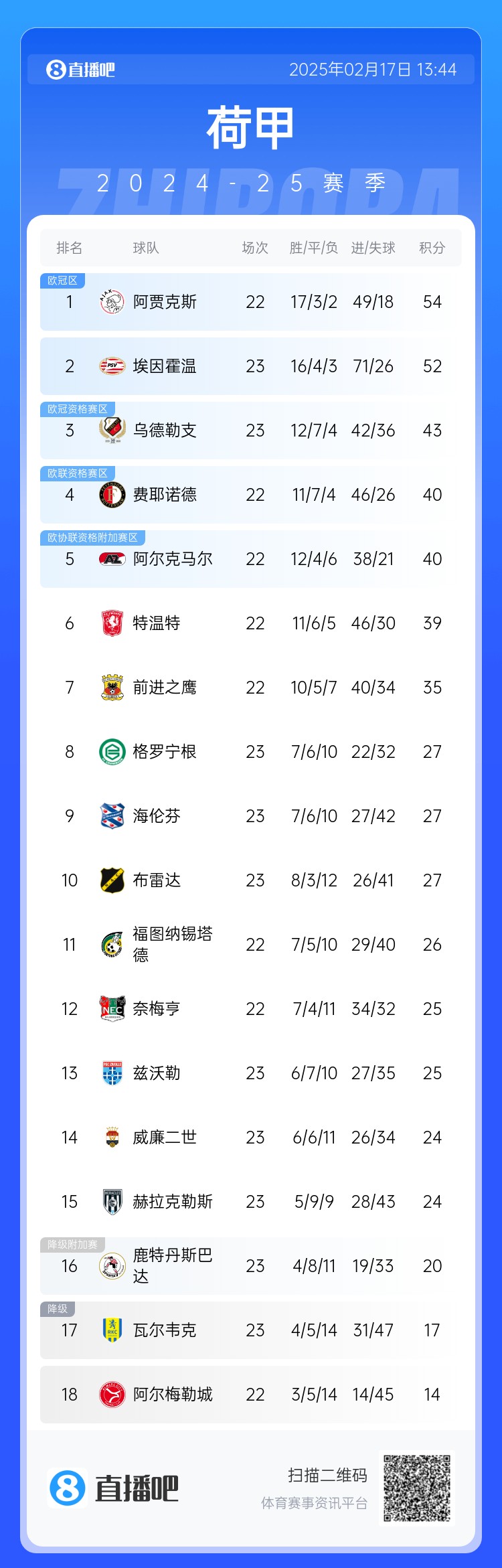 除特別注明外,本站所有內(nèi)容均為九球直播整理排版,轉(zhuǎn)載請注明出處:殺瘋了!賈府7連勝少賽一場2分領(lǐng)跑荷甲,埃因霍溫狂轟31腳憾平
