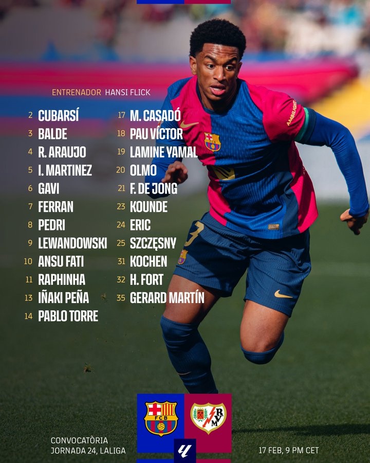 2月17日訊 北京時間明天凌晨4點,巴薩將在西甲主場迎戰(zhàn)巴列卡諾,球隊今天公布了比賽名單,具體如下: