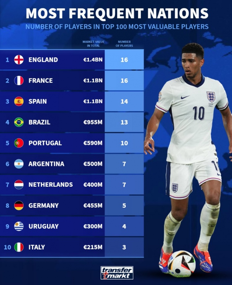 除特別注明外,本站所有內(nèi)容均為九球直播整理排版,轉(zhuǎn)載請注明出處:德轉(zhuǎn)列身價前100球員國籍:英法各16人,西、巴、葡列前五