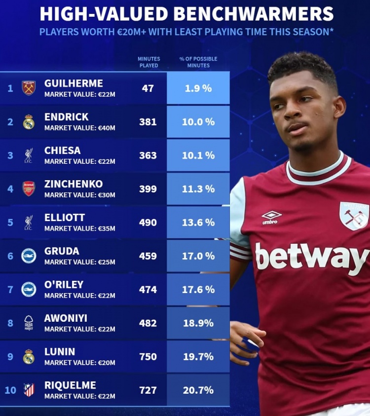 2月18日訊 《轉會市場》統(tǒng)計了本賽季身價2000萬歐元以上球員的出場時間情況,并列出了冷板凳榜單。