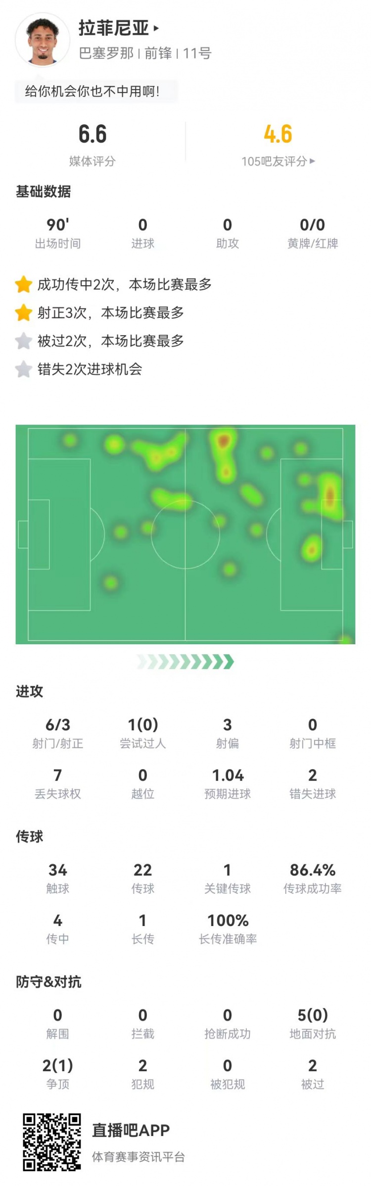 發(fā)布時間:2025年02月18日 06:50點擊:欄目:足球新聞 2月18日訊 巴薩在本輪西甲1-0險勝巴列卡諾,拉菲尼亞本場數(shù)據(jù)如下:首發(fā)踢滿全場預期進球1.0434觸球22傳球、19成功,成功率86%1關鍵傳球4傳中、2成功1長傳、1成功6射門、3射正1過人、0成功2錯失重大機會7對抗、1成功7丟失球權2犯規(guī)2被過獲評6.6分 除特別注明外,本站所有內容均為九球直播整理排版,轉載請注明出處:低迷!拉菲尼亞本場6射3正2失良機 1關鍵傳球+7對抗1成功 獲6.6分 本文標簽: 足球 西甲 巴塞羅那 巴列卡諾