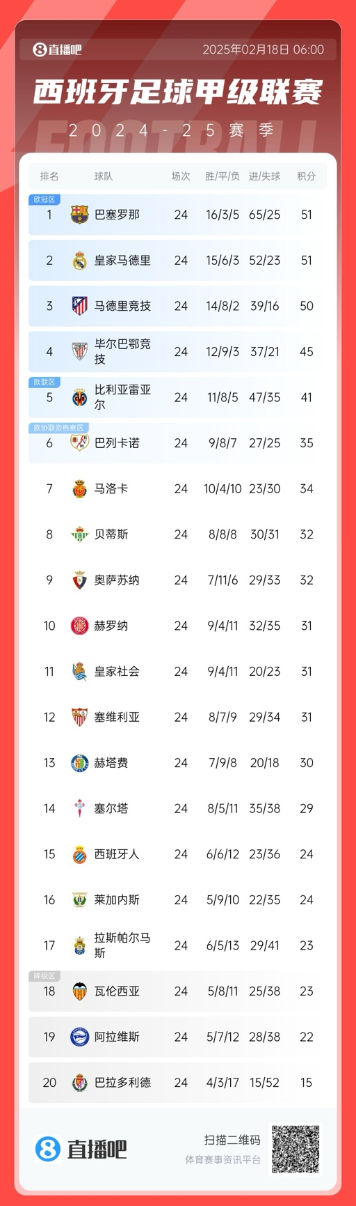 2月18日訊 西甲第24輪,巴塞羅那1-0小勝巴列卡諾,重回西甲榜首。