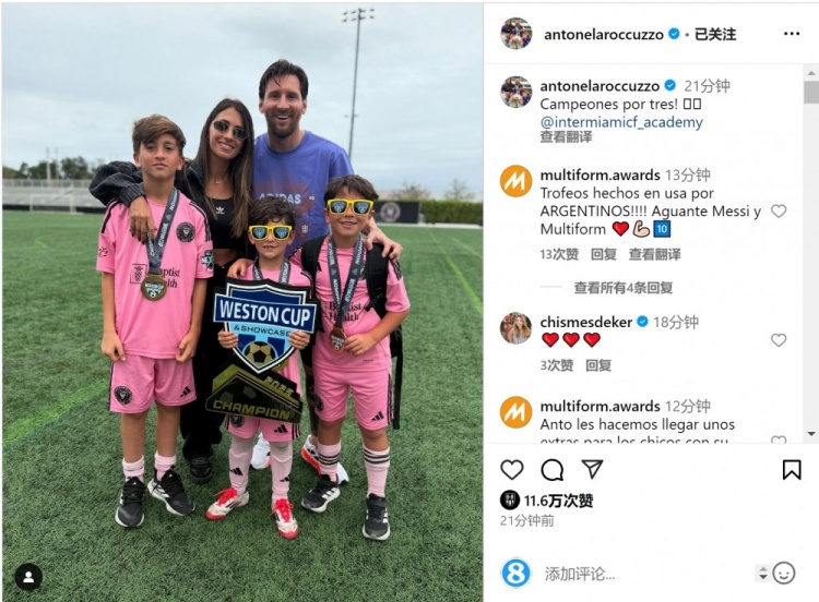 梅西的三個兒子隨邁阿密國際青訓(xùn)梯隊參加韋斯頓杯比賽,安東內(nèi)拉社媒曬出一家人的合照,蒂亞戈、馬特奧、西羅均佩戴冠軍獎牌,配文:“三個冠軍!”