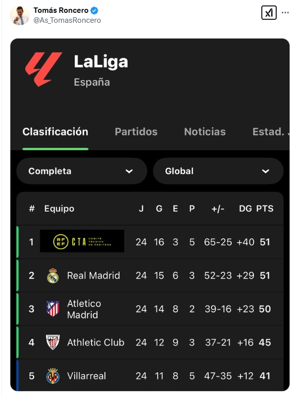 龍賽羅在社媒曬出最新積分榜,將榜首的巴薩的隊(duì)徽換成了裁判技術(shù)委員會的標(biāo)志。