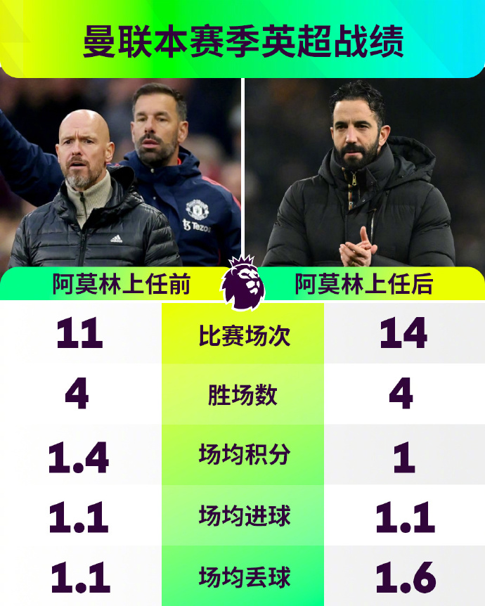 阿莫林上任前:11場(chǎng)4勝、場(chǎng)均積分1.4、場(chǎng)均進(jìn)球1.1、場(chǎng)均丟球1.1