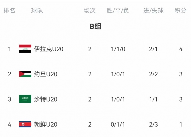 不過B組當前形勢較為復雜,沙特U20將在末輪對陣朝鮮U20、伊拉克U20則將和約旦U20對話。4支球隊均存在晉級可能和出局可能。除了朝鮮U20之外,其他3隊都可能成為小組頭名。由于B組末輪比賽將在明日才會開戰(zhàn),也無從參考。