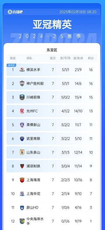 目前在積分榜上,上海申花隊(duì)2勝1平4負(fù)暫列亞冠精英聯(lián)賽東亞區(qū)第10位。