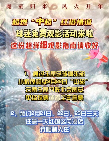 2月18日訊 據(jù)“玉溪市紅塔區(qū)融媒體中心”官方報(bào)道,現(xiàn)場(chǎng)觀看云南玉昆中超首輪比賽并入住當(dāng)?shù)鼐频?,將免費(fèi)送電影票。