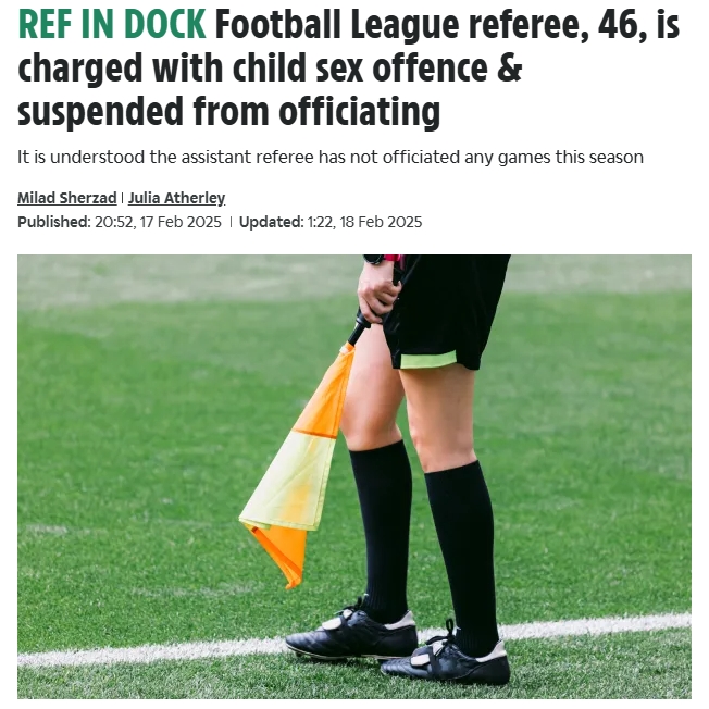 2月18日訊 《太陽報》報道,一位曾擔任英格蘭足球聯(lián)賽(EFL,負責英冠、英甲、英乙)和足總杯比賽助理裁判的男子將因涉嫌兒童性犯罪出庭受審。