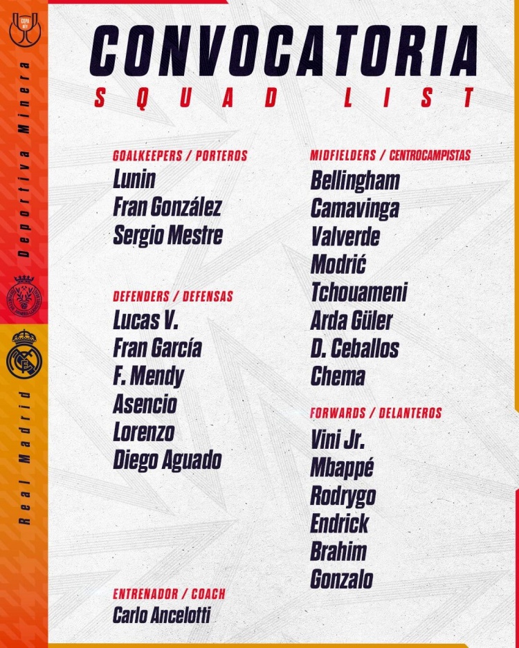 1月5日訊 北京時間下周二凌晨2:00,皇馬將在國王杯第3輪中客戰(zhàn)米內(nèi)拉。賽前,皇馬官方公布了將出戰(zhàn)本場比賽的大名單。其中,維尼修斯、姆巴佩、卡馬文加等人在列,呂迪格、庫爾圖瓦缺席。