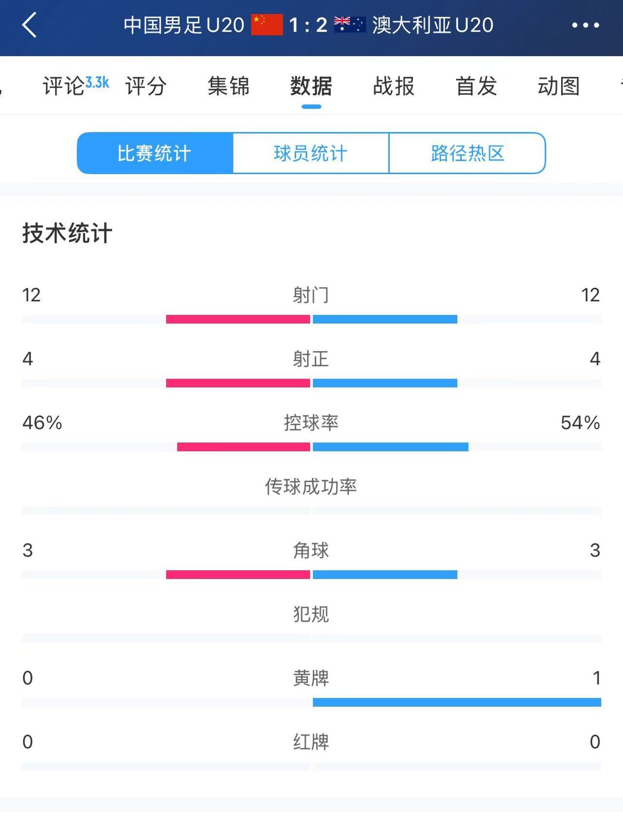 在控球率方面,U20國足為46%,澳大利亞U20為54%。射門次數(shù)上,兩隊均有12次射門,均有4次射正。