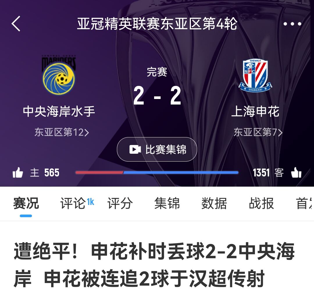 在對陣倒數(shù)第一中央海岸水手時,申花在比賽最后時刻被對手絕平,送給中央海岸水手本屆亞冠首個積分,也是唯一的積分↓