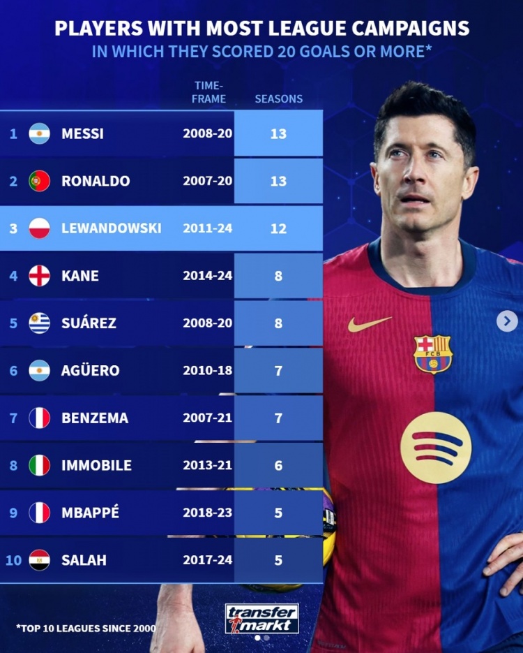 德轉(zhuǎn)列新世紀(jì)歐洲前十聯(lián)賽單賽季進(jìn)球20+次數(shù)榜: