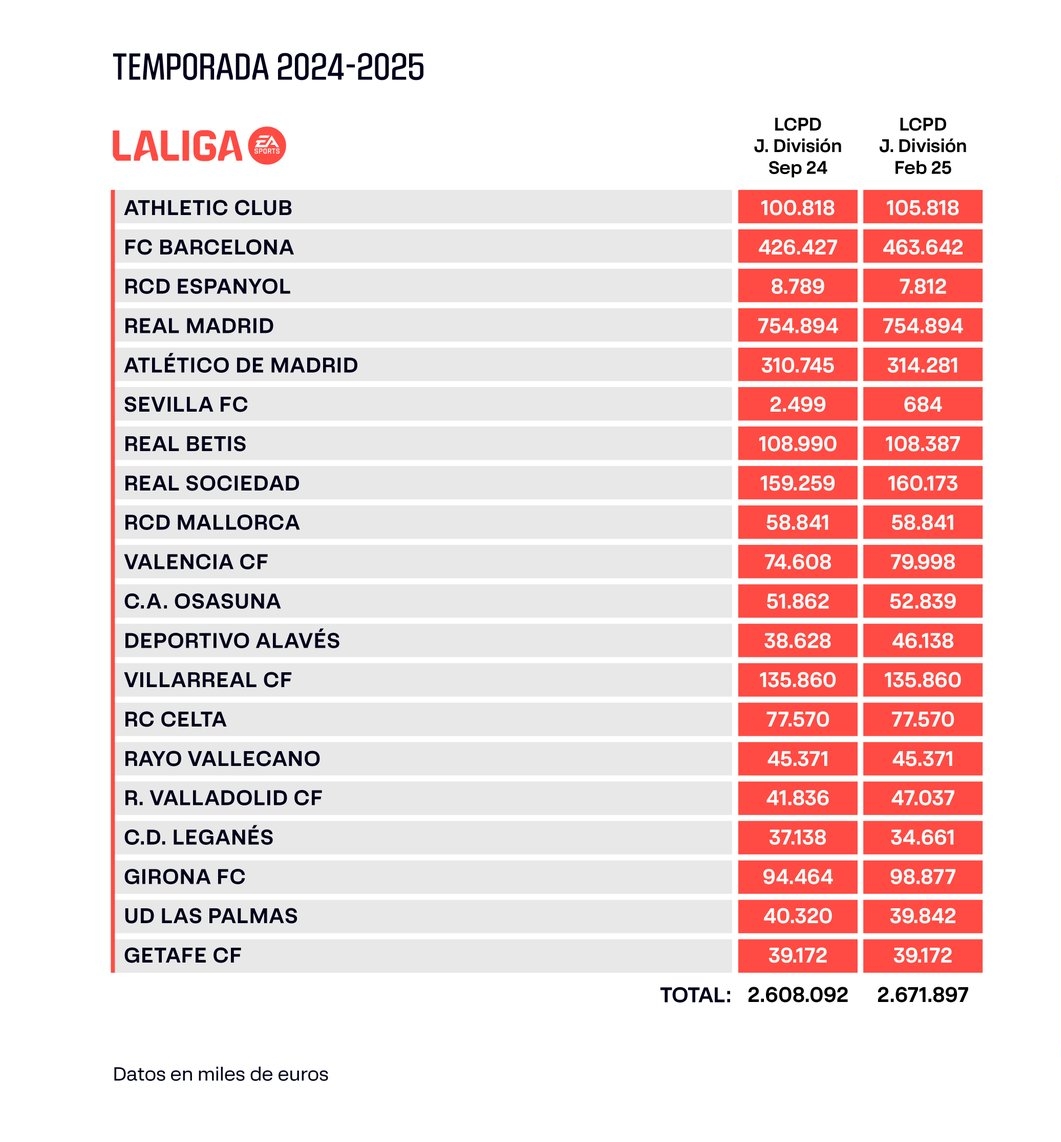 2月19日訊 西甲官方在冬窗后更新了更新的各隊工資帽,皇馬7.55億歐居首,巴薩4.64億歐第二。