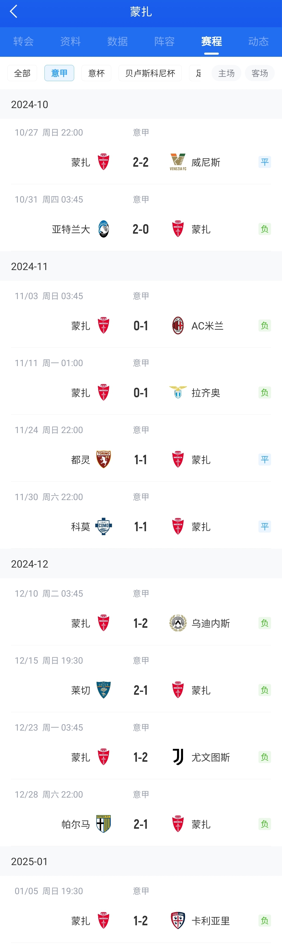 目前蒙扎僅積10分,位列意甲倒數(shù)第一。