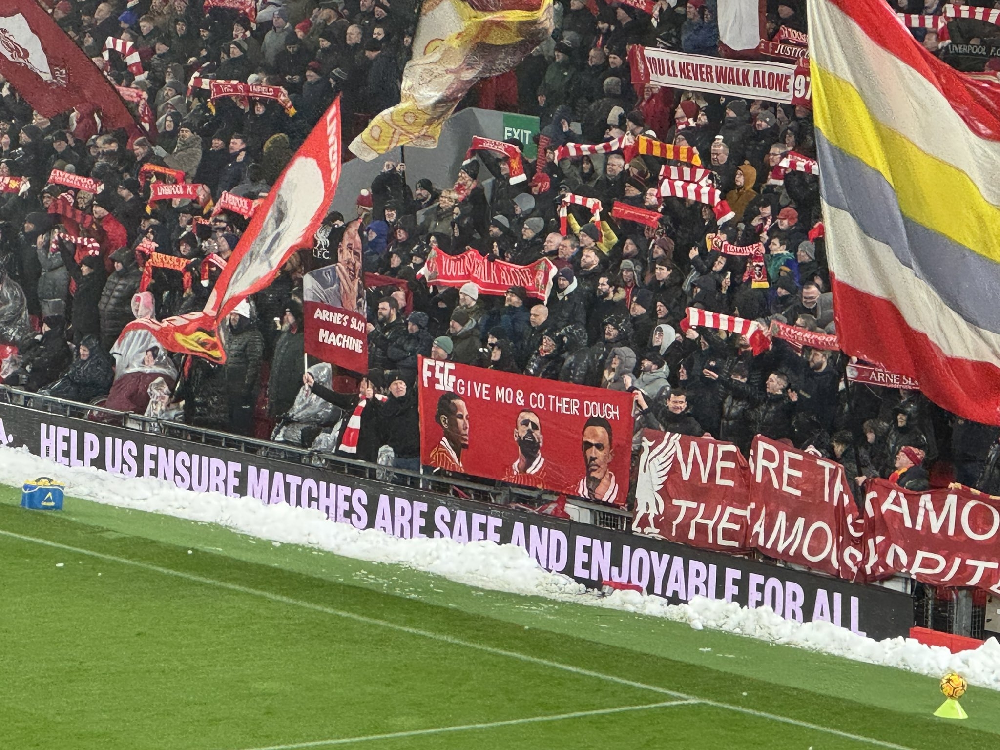 橫幅上畫著薩拉赫、范迪克和阿諾德的頭像,并寫著:“芬威,把薩拉赫和隊友要的錢給他們!”