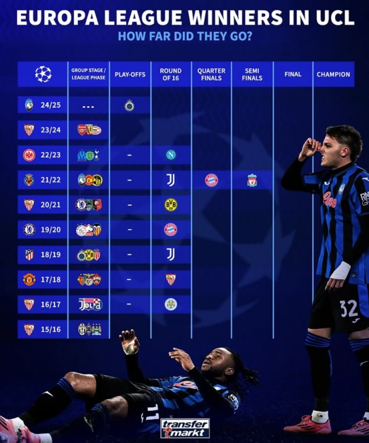 2月20日訊 亞特蘭大在本輪歐冠附加賽被布魯日淘汰出局,表現(xiàn)未能達(dá)到預(yù)期?!掇D(zhuǎn)會(huì)市場》也列出了近10年歐聯(lián)杯冠軍在第二年參加歐冠的成績。