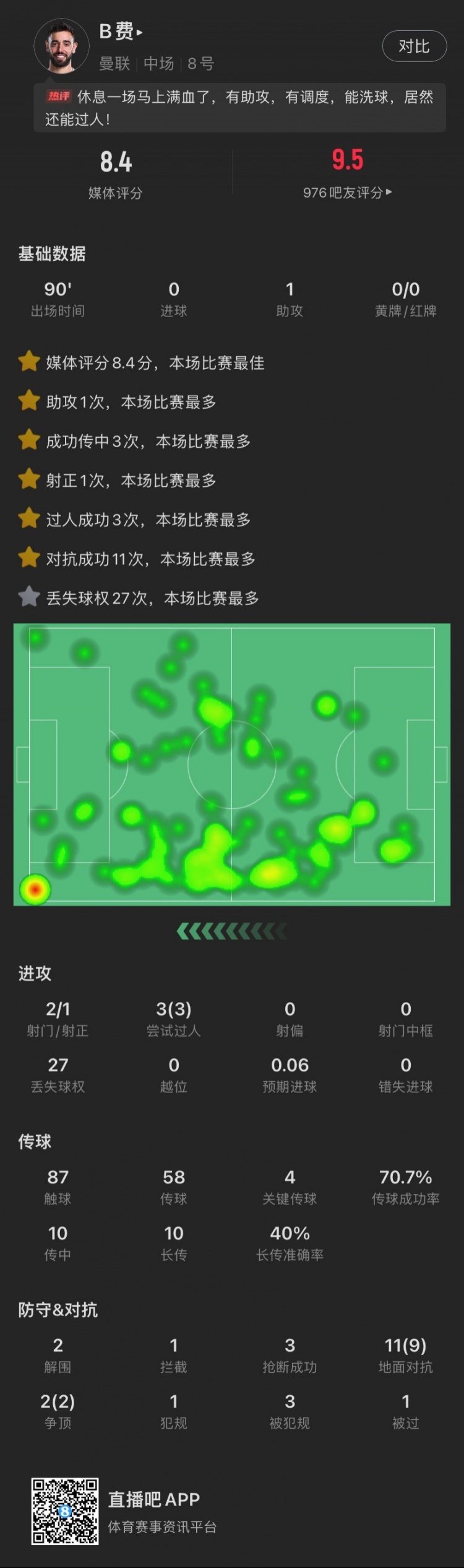 B費(fèi)本場(chǎng):1助攻,3次過人&11次對(duì)抗成功全場(chǎng)最多,8.4分全場(chǎng)最高