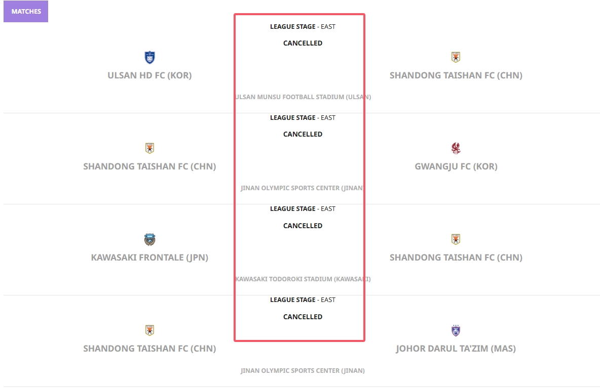 - 亞足聯(lián)官網(wǎng)顯示:山東泰山8場(chǎng)亞冠全部“取消”!積分榜數(shù)據(jù)清零