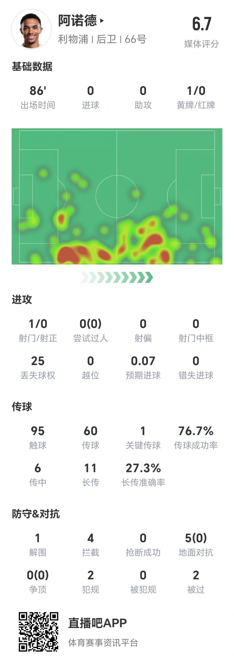 技術(shù)統(tǒng)計(jì)數(shù)據(jù)顯示,本場(chǎng)比賽阿諾德有1次解圍,4次攔截,兩次被過(guò),5次地面對(duì)抗均沒(méi)有成功,25次丟失球權(quán),1次關(guān)鍵傳球,6次傳中均未成功,11次長(zhǎng)傳僅成功3次。