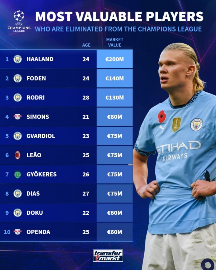 除特別注明外,本站所有內(nèi)容均為九球直播整理排版,轉(zhuǎn)載請注明出處:歐冠出局球員身價榜:哈蘭德2億歐居首,前10名曼城占6席