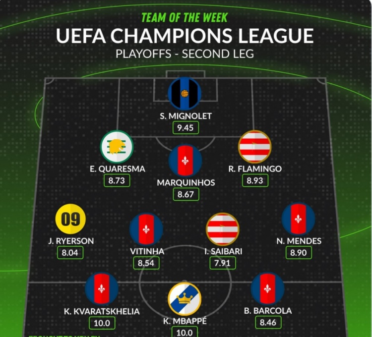 2月20日訊 歐冠淘汰賽附加賽次回合比賽戰(zhàn)罷,WhoScored列出了歐冠本周最佳陣容,姆巴佩、克瓦拉茨赫利亞領(lǐng)銜,巴黎5名球員入選。