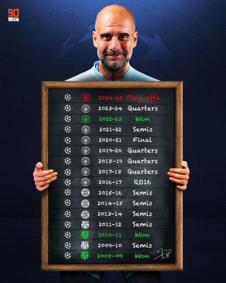 90min Football統(tǒng)計了瓜迪奧拉執(zhí)教生涯至今的歐冠成績,他帶隊獲得3次冠軍、1次亞軍,6次止步4強(qiáng),本賽季是首次未進(jìn)入16強(qiáng)。
