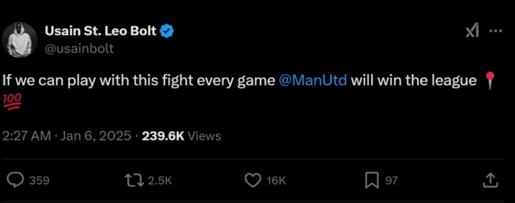 博爾特寫道:“如果我們每場(chǎng)比賽都能踢出這樣的斗志,曼聯(lián)就會(huì)贏下聯(lián)賽冠軍。