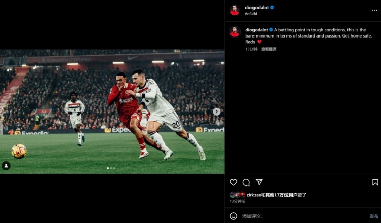 1月6日訊 本輪英超雙紅會(huì)焦點(diǎn)戰(zhàn),曼聯(lián)在安菲爾德2-2戰(zhàn)平利物浦。賽后,達(dá)洛特更新動(dòng)態(tài),激勵(lì)球隊(duì)并感謝了遠(yuǎn)征的球迷們。