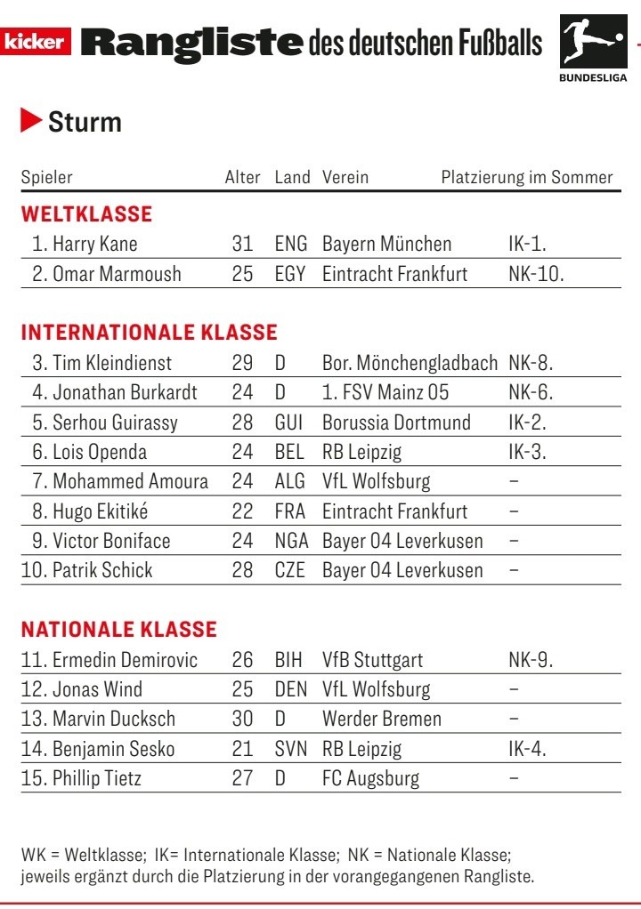 1月6日訊 德甲上半程已經(jīng)完賽,《踢球者》按照慣例對(duì)上半賽季各位置球員進(jìn)行評(píng)級(jí),前鋒位置如下: