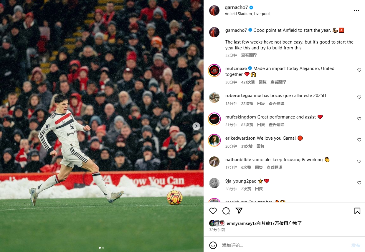 1月6日訊 英超第20輪,曼聯(lián)客場(chǎng)2-2利物浦,賽后加納喬更新了社媒。