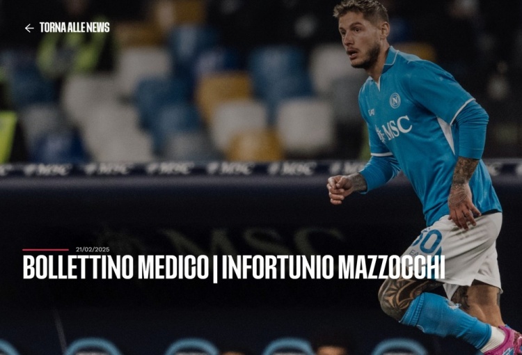 2月21日訊 那不勒斯官方確認,隊內(nèi)右后衛(wèi)馬佐基訓(xùn)練中肌肉受傷。