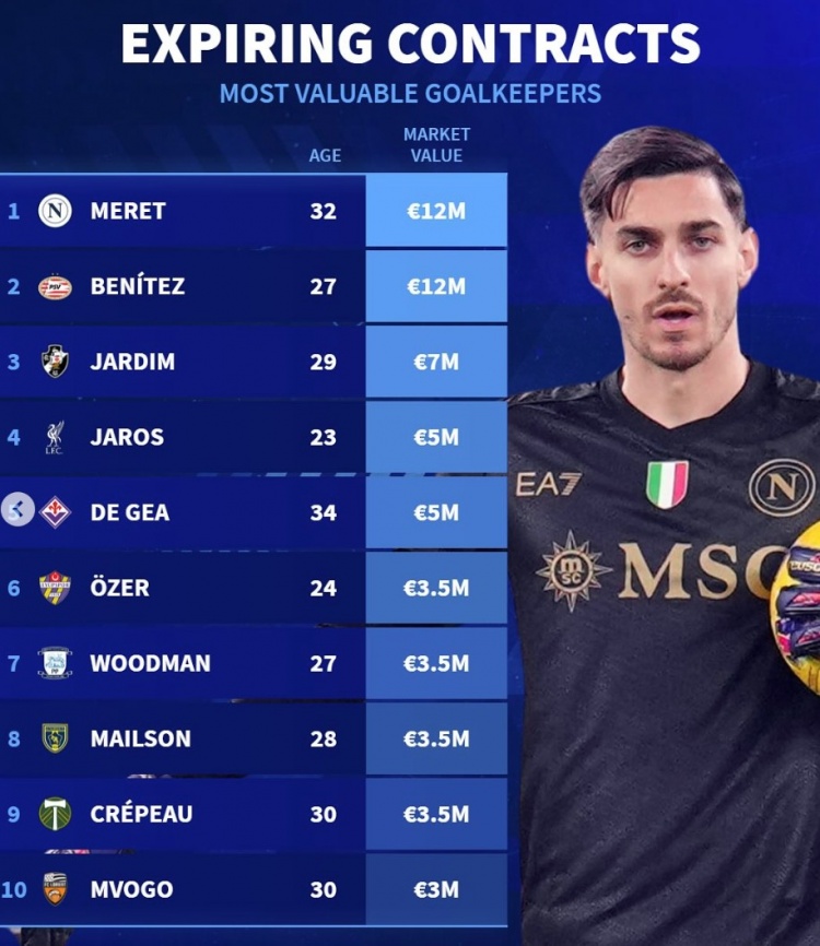 2月21日訊 《轉(zhuǎn)會(huì)市場(chǎng)》統(tǒng)計(jì)了今年合同到期的門將身價(jià)情況,那不勒斯門將梅雷特并列居首。