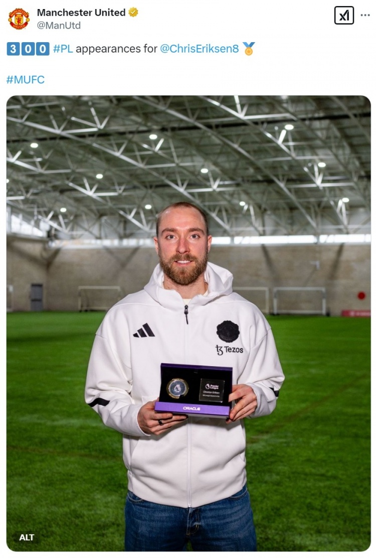 曼聯(lián)官方社媒曬出埃里克森領(lǐng)取紀(jì)念品的照片,祝賀他達(dá)成英超300場(chǎng)里程碑。