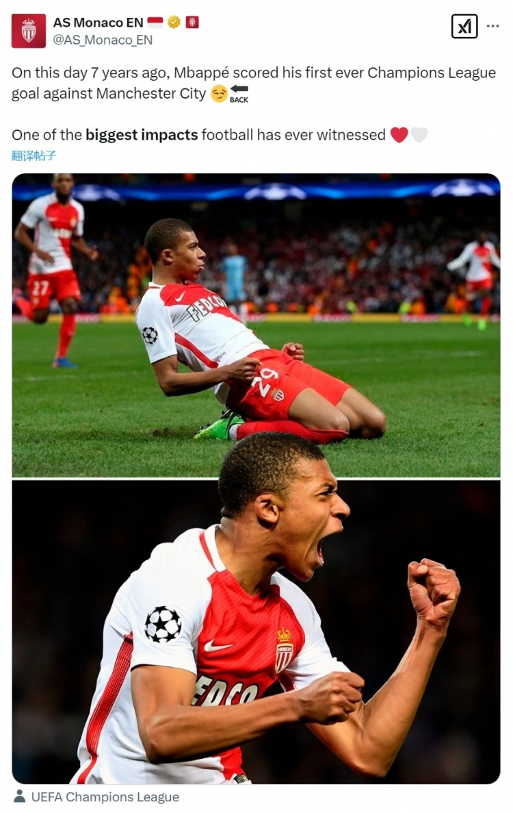 - 姆巴佩八年前的今天攻入歐冠處子球,對(duì)手也是曼城