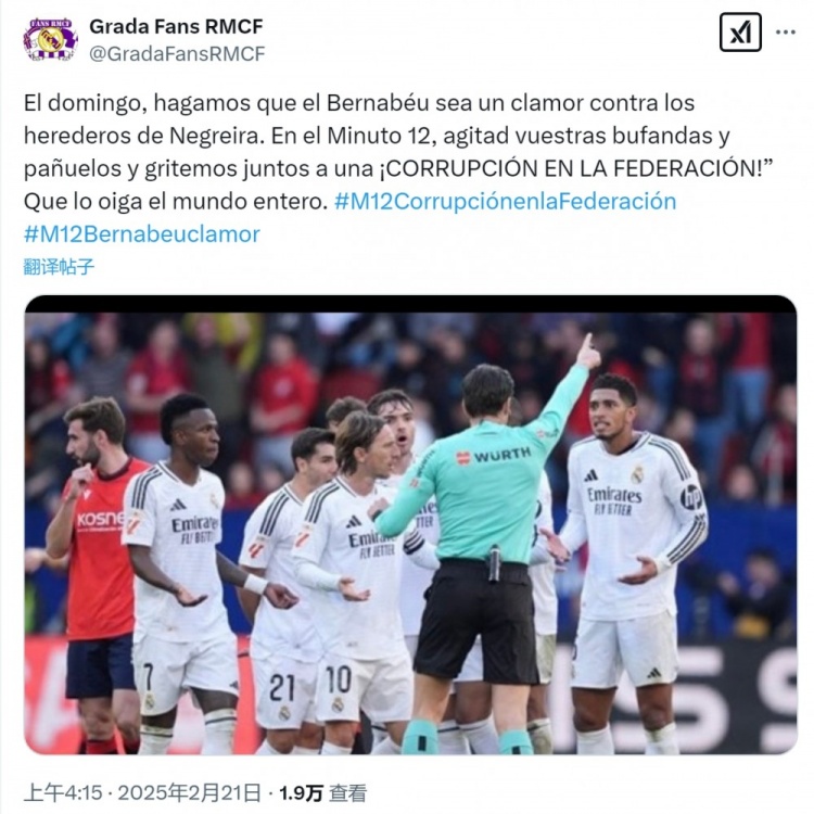 2月21日訊 皇馬球迷組織Grada Fans RMCF社媒發(fā)文,號召球迷在比賽中抗議裁判和西班牙足協(xié)。
