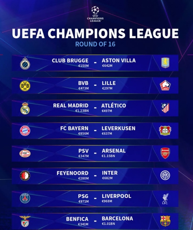 2月21日訊 歐冠十六強對陣已經(jīng)出爐,《轉(zhuǎn)會市場》也列出了各隊身價情況。