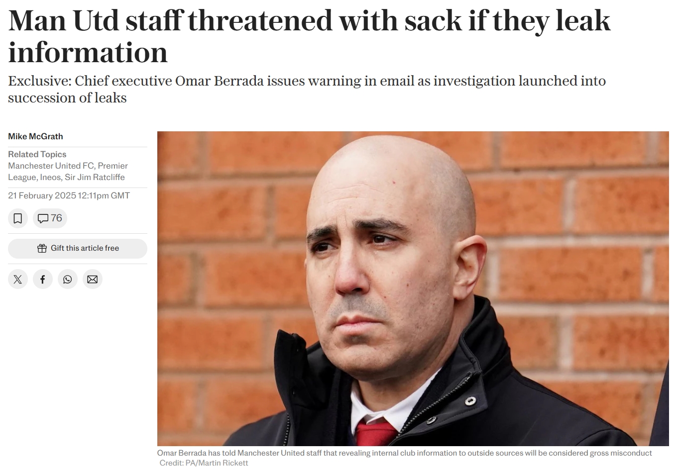 曼聯(lián)此前深受隊(duì)內(nèi)首發(fā)信息被提前泄露的困擾。在本周早些時(shí)候,貝拉達(dá)向曼聯(lián)員工發(fā)送了一封580字的郵件,工作人員被告知俱樂部目前正在采取額外措施防止這一現(xiàn)象發(fā)生。