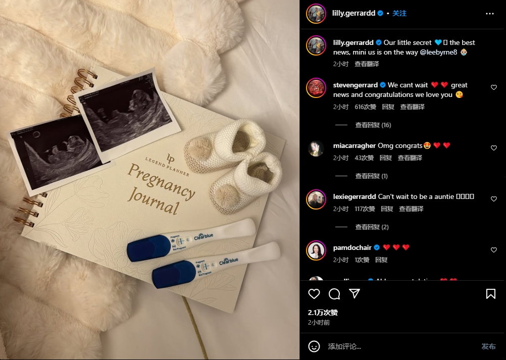 莉莉-杰拉德曬出了自己懷孕的圖片,并且配文:我們的小秘密,最好的消息,小小的我們要來(lái)了。杰拉德也在這條社媒下回復(fù):“我們等不及了,恭喜,我們愛(ài)你。”